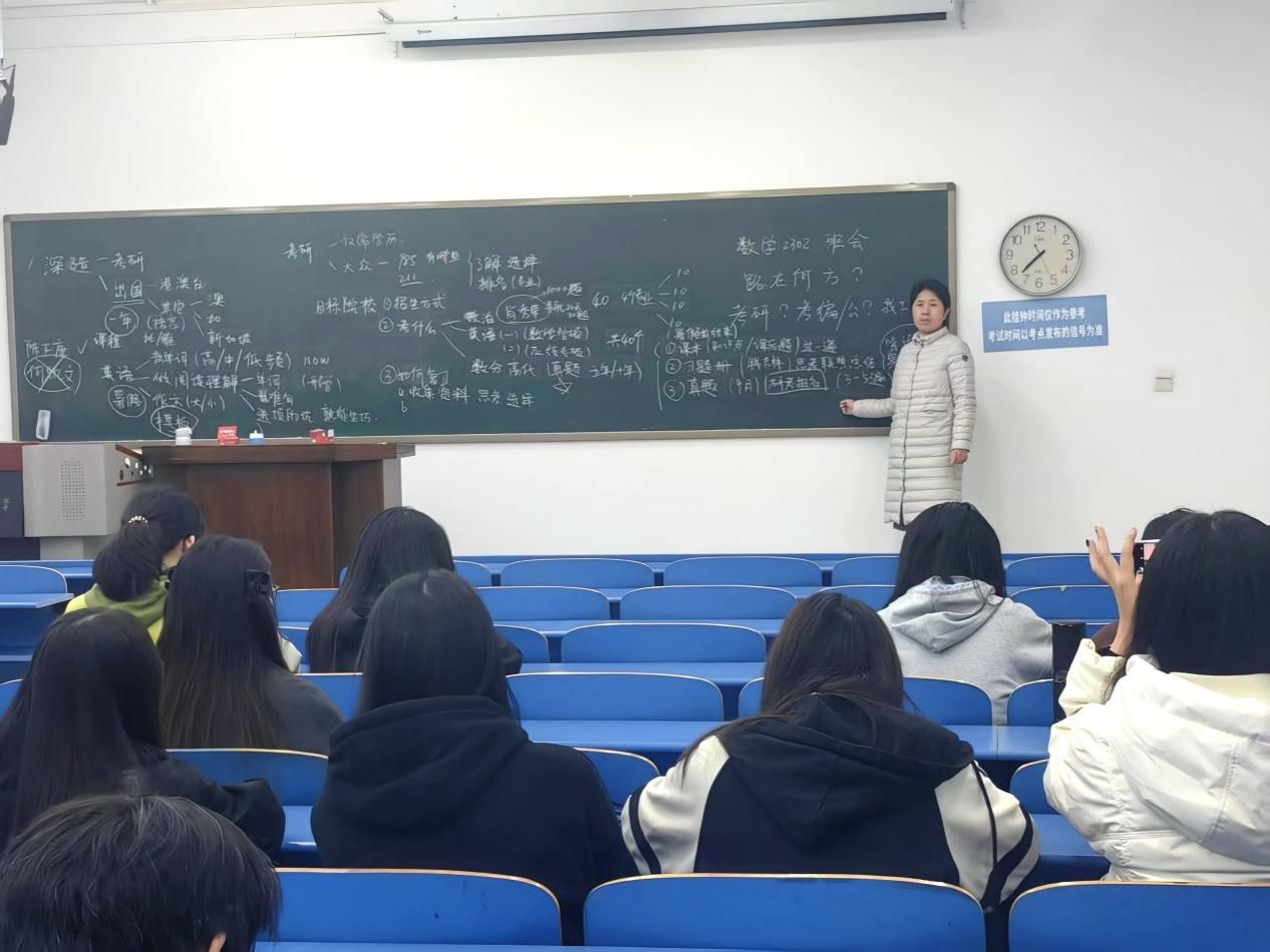 班会上,卫老师结合自身考研经历,从实际需求出发拆解完整备考路径。她强调,考研既是知识积累的过程,更是对心理素质与学习毅力的综合淬炼。在院校与专业选择上,她建议同学们立足自身实力与兴趣,全面分析目标院校的招生政策与专业排名;科目备考方面,需以课本知识为核心、习题册为辅助,深耕真题,强化掌握数学分析、高等代数等专业课,同时明确政治与英语的复习步骤;时间规划层面,卫老师给出明确且可落地的进度节点:建议同学们在大三结束前完成首轮复习,为后续学习打下坚实基础;暑期则需聚焦重点、集中强化薄弱板块;9月起必须启动真题集中训练,通过实战查漏补缺;考前阶段则应全力投入模拟冲刺,以最佳状态迎接考试,助力同学们科学高效推进备考进程。