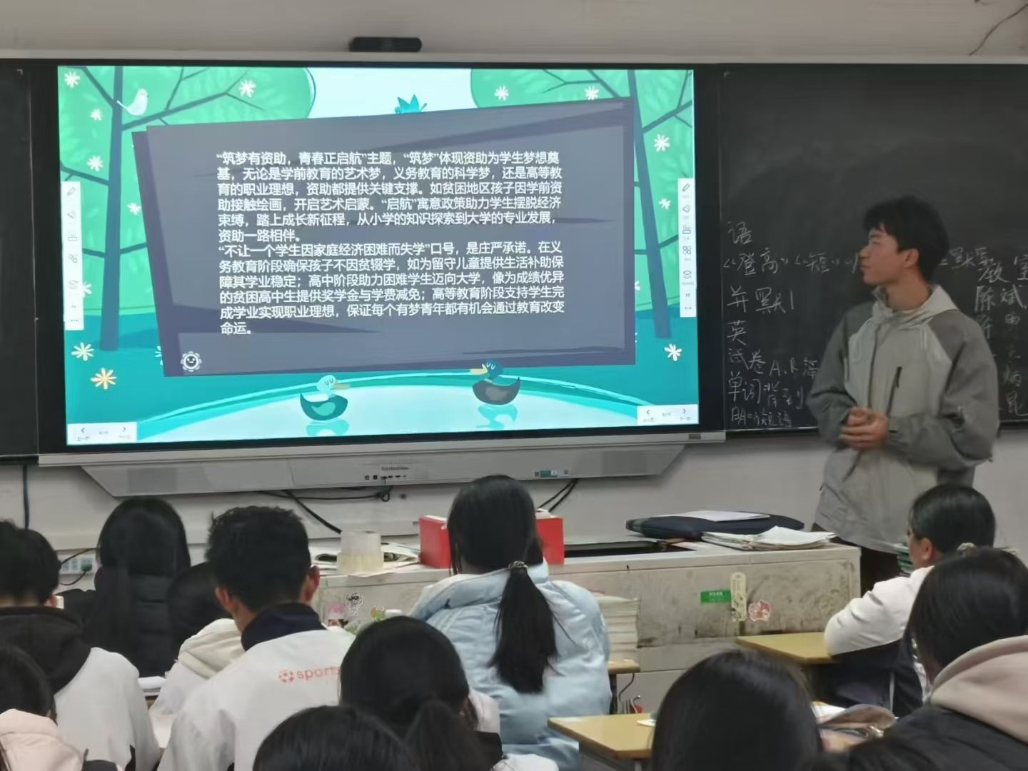 宣讲现场,讲解人通过播放河南工业大学宣传片、发放政策手册、答疑解惑等方式,系统介绍国家奖学金、助学金、生源地贷款等项目的申请条件与办理流程。讲解者更是以“受益者”与“过来人”的双重身份,不仅讲透政策,更讲活故事——通过分享自身从申请资助到励志成长的真实经历,生动展现了如何借助政策支持解决学费、生活费等实际困难。真挚的分享有效缓解了在场学子的经济顾虑,点燃了高中生们对大学生活的向往与信心,现场互动热烈,反响积极。