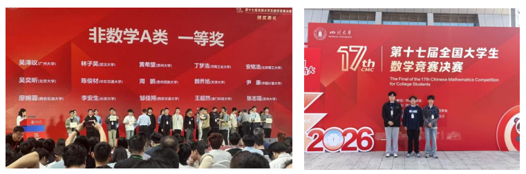 2026年4月17日至19日,由中国数学会主办的第十七届全国大学生数学竞赛决赛在四川成都隆重举行。本次竞赛由四川大学承办,成都理工大学、四川省数学会协办。在此次竞赛中,我校学子表现突出,3名参赛选手全部获奖,共斩获全国一等奖1项、二等奖1项、三等奖1项,获奖级别和数量实现历史性突破,创下学校参加该赛事以来最佳成绩!其中2022级计算机科学与技术专业丁梦浩斩获非数学A类全国一等奖、2022级人工智能专业翟智恒斩获非数学A类全国二等奖 、 2022级数学与应用数学专业荣朋斩获数学专业组(高年级)全国三等奖。