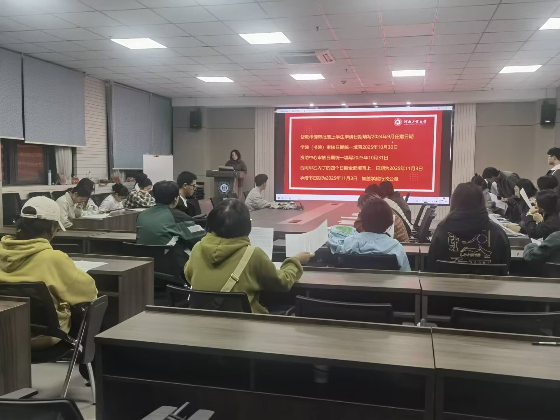 在惟德楼315会议室召开国家助学贷款合同签约暨诚信教育大会。学院资助负责老师赵洁、资助助理以及申请2025年国家助学贷款的学生参加会议。