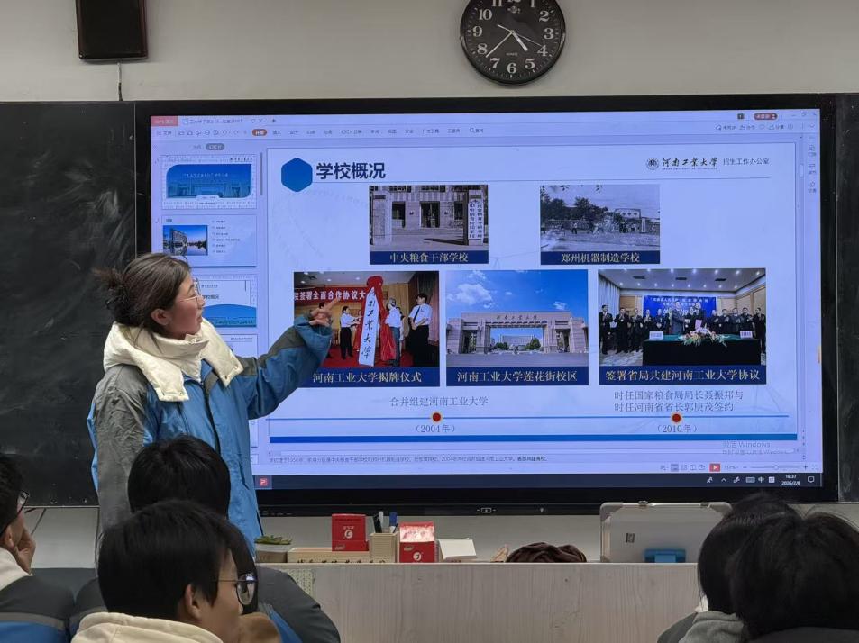 宣讲刚开始,王若涵同学结合自身专业学习经历,聚焦河南工业大学的核心办学特色,重点介绍了食品科学与工程、粮食工程、机械工程等“双一流”建设相关学科群,以及计算机科学与技术、土木工程、会计学等国家级一流本科专业的建设成果。通过分享学科领域的科研突破、校企合作项目、实习就业案例等,让学子们直观感受河工大在“粮食产后安全”“智能制造”等领域的行业优势与育人实力,帮助同学们清晰认知不同专业的发展前景。