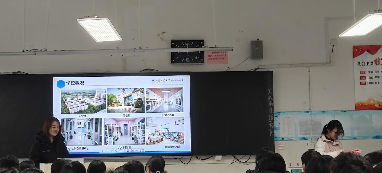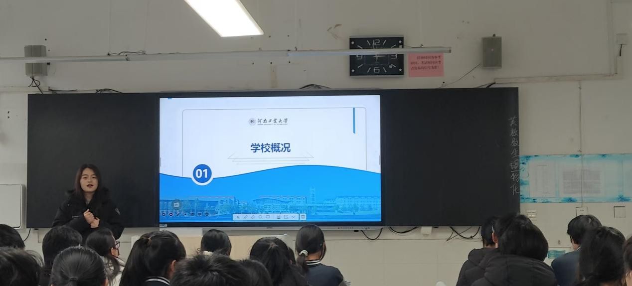 宣讲伊始,张晓彤以亲切的“学姐”身份开场,迅速拉近了与同学们的距离。他从河南工业大学的办学历史、学科优势、师资力量、校园环境等方面入手,用生动的案例和真实的校园照片,为学弟学妹们勾勒出一幅立体鲜活的工大画卷。