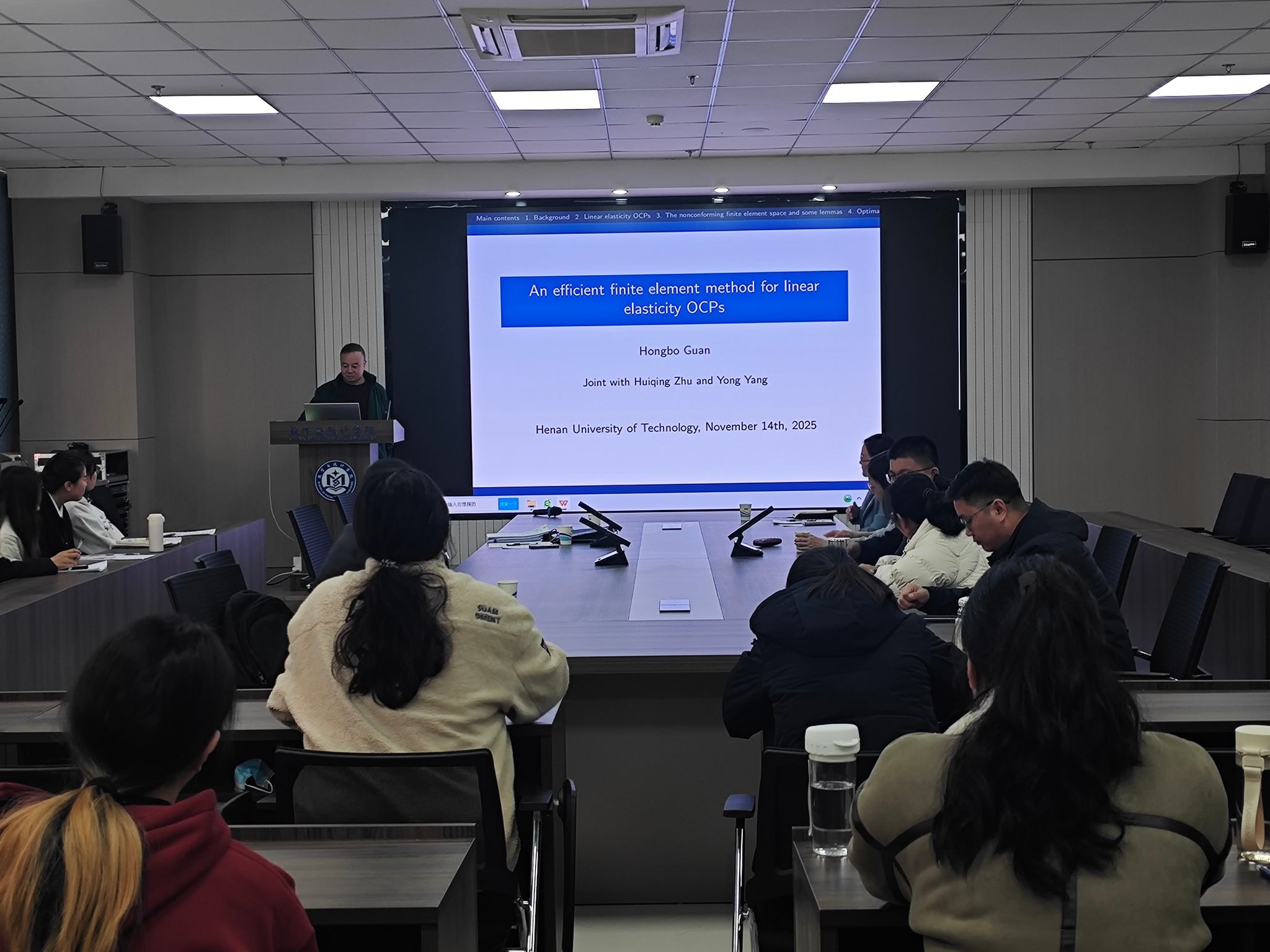 邀请,郑州轻工业大学数学与信息科学学院关宏波教授在莲花街校区惟德楼315会议室作了题为“An efficient finite element method for linear elasticity OCPs”的学术报告。学院副院长曹建莉、科研创新团队青年教师、全体研究生及部分本科生参加了本次报告。报告会由曹建莉主持。