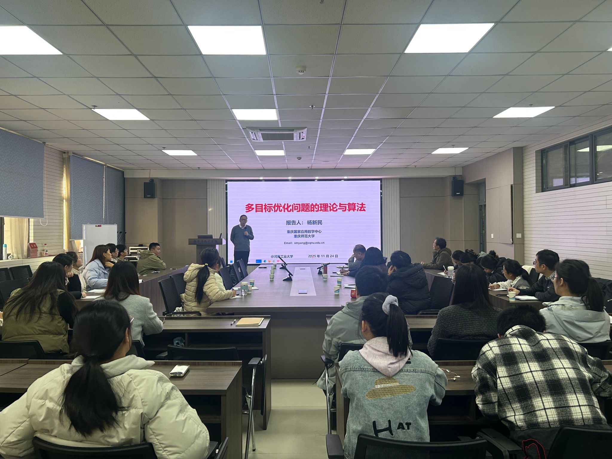 邀请,国际系统与控制科学院院士、重庆国家应用数学中心主任、重庆师范大学博士生导师杨新民教授在惟德楼315会议室作了题为“多目标优化问题的理论与算法”的学术报告。院长谷存昌、副院长曹建莉、学院科研创新培育团队青年骨干教师、全体研究生及部分本科生参加了报告会。会议由谷存昌主持。